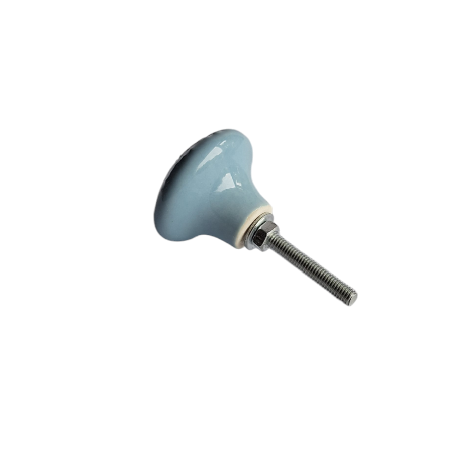 Dit porseleinen licht blauwe knopje met een bloem motief geeft een frisse uitstraling aan je meubel. Het kastknopje is gemakkelijk te bevestigen op een lade of deur van een meubel.