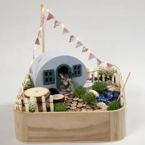 Deze houten Hippie Caravan geeft je meteen een vakantie gevoel. De caravan past goed bij het VW busje en kan je helemaal decoreren naar jou eigen creatieve ideeen met verschillende kleuren Fusion verf.
