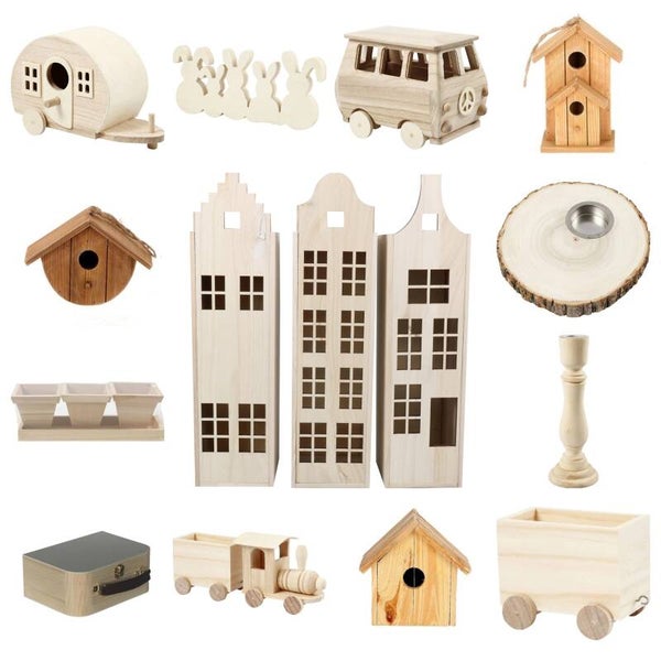 De houten DIY producten variëren van een hippie VW busje, een caravan, grachtenpandjes, een treintje met wagonnetjes, kandelaar, leuke konijntjes, kinderkoffertje, vogelhuisjes, enz.