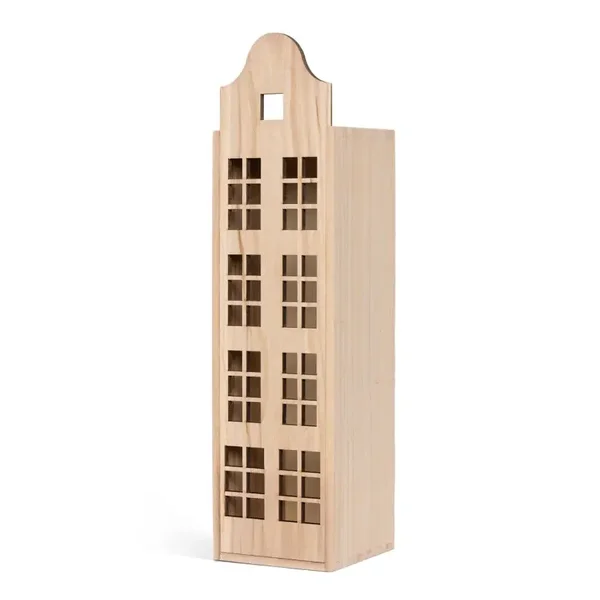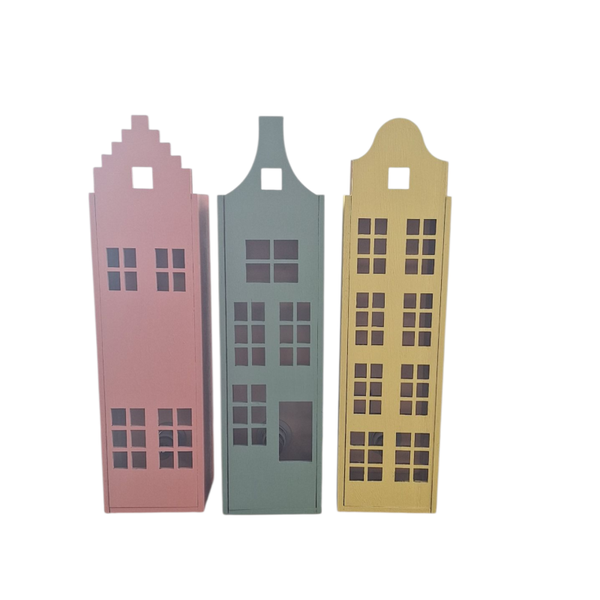 Dit leuke grachten pandje is eigenlijk een wijn kistje. Je kan de voorkant er afschuiven en er een lampje in doen voor een gezellige sfeer. Het grachtenpandje kan je helemaal decoreren naar jou eigen creatieve ideeen met verschillende kleuren Fusion verf. Er zijn drie varianten huisjes