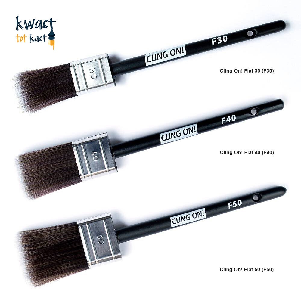 De Cling On! platte kwast (F40) is een fijne kwast om te gebruiken op vlakke ondergronden zoals panelen en deuren. Wanneer je een groot oppervlak hebt, is het het prettigst om met grotere kwast te verven. De F40 is een van de meest verkochte kwasten van Cling On!