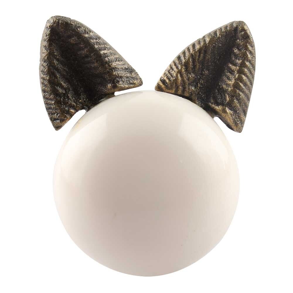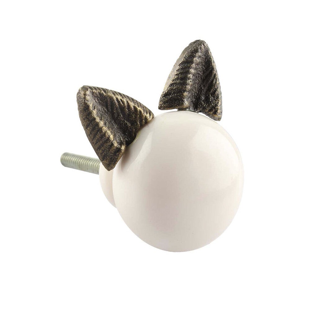Dit schattige witte kastknopje met koperen oortjes als detail is een echte eyecatcher. Het kastknopje is gemakkelijk te bevestigen op een lade of deur van een meubel.